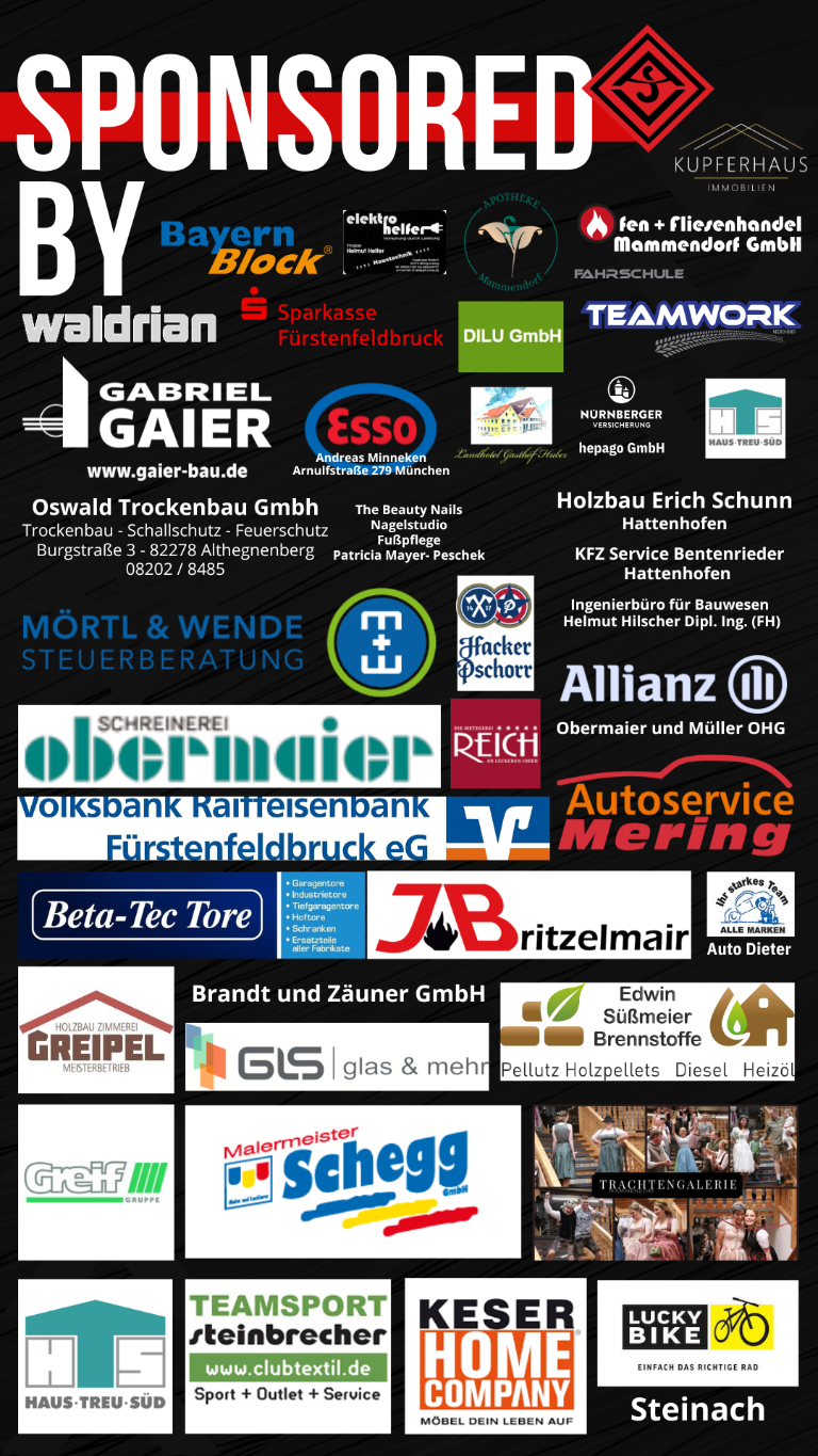 Ein herzliches Dankeschön geht an das Physio Team FFB von Jakob Kistler, die Oswald Trockenbau GmbH, Kupferhaus Immobilien, die GLS GmbH sowie den Ofen Fliesenhandel Mammendorf. Mit ihrem Engagement zeigen diese Unternehmen ihre enge Verbundenheit zum lokalen Vereinssport und unterstützen aktiv den Amateurfußball.